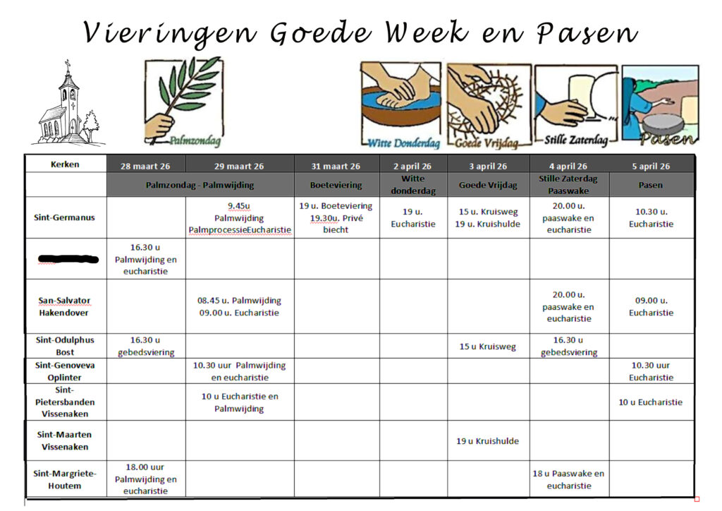 | Sint-Germanus (Veemarkt Tienen) | 19u00 Aanbidding | 9u00 | 19u00 | 9u00 | 8u00 ochtendgebed | 10u30 |