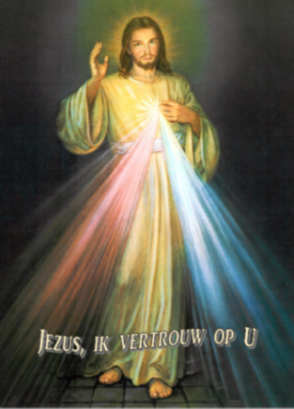 Nog iets over deze afbeelding. Wat kunnen we daarvan leren? Drie dingen. Ten eerste: op de afbeelding staat ‘Jezus, ik vertrouw op U’; vertrouwen, blijven vertrouwen ondanks alles. Ten tweede: bidden; bidden om met Jezus Christus en elkaar verbonden te blijven en dan zegent Hij je. Ten derde: aandacht hebben voor de mensen rondom je; barmhartig zijn zoals God barmhartig is. Daarom: kies voor Hem. Het is de beste keuze. Hij is de beste levenspartner die het beste in je naar boven haalt. Ondertussen leven we in een onzekere tijd, maar als we dicht bij de Heer blijven, in gebed en met elkaar verbonden, dan komt het uiteindelijk goed. Jezus, ik vertrouw op U. Amen.