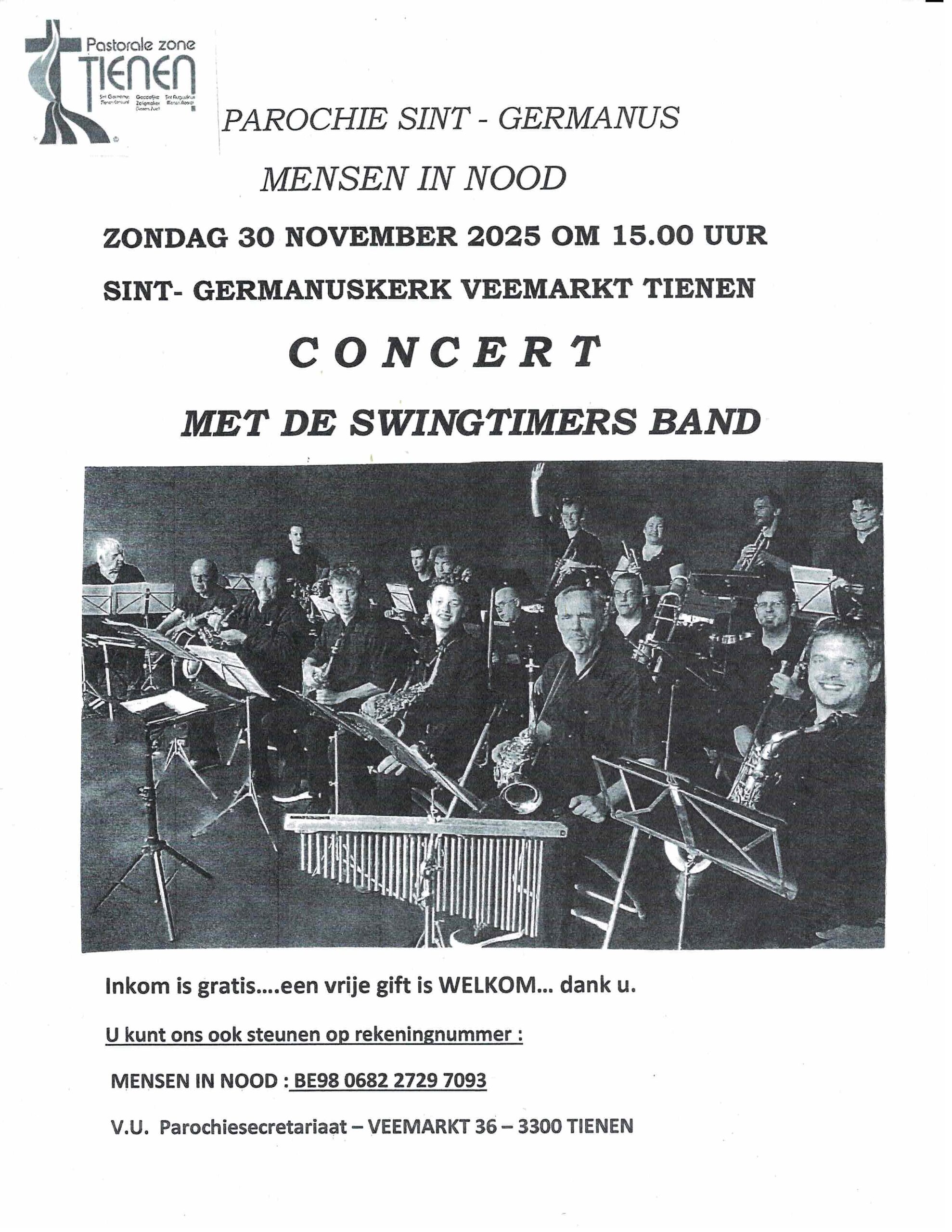 Op zondag 30 november is er in de Sint-Germanuskerk een concert ten voordele van MENSEN IN NOOD. Een organisatie dat al meer dan 30 jaar bestaat en opgericht is door onze betreurde pastoor Joris Hardiquest en zijn parochieploeg. Dit jaar komt de Swingtimers Band het concert verzorgen en ze starten om 15.00u. Iedereen is van…