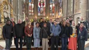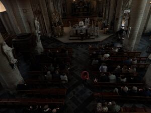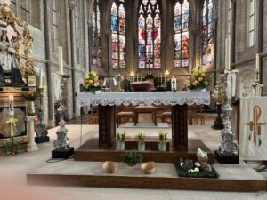 Paasviering in de mooi versierde en pas gepoetste Sint-Genovevakerk van Oplinter en zoals het koor in het intredelied zong: ‘licht, ontloken aan het donker’…